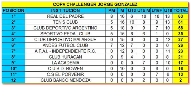 OBTUVO LA PUNTUACIÓN MAS ALTA EN LA SUMATORIA DE TODAS LAS CATEGORIAS FORMATIVAS, FUE SEGUIDO EN SEGUNDO LUGAR POR SAN RAFAEL TENIS CLUB Y EL PODIO LO COMPLETO EL CLUB DEPORTIVO ARGENTINO.